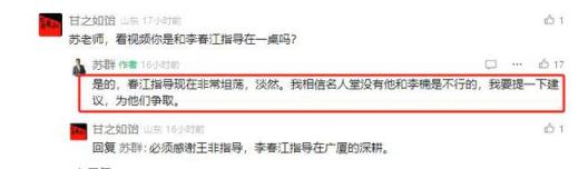 蘇群在與球迷互動中是這樣說,“是的,春江指導現在非常坦蕩,淡然。我相信名人堂沒有他和李楠是不行的,我要提一下建議,為他們爭取?!鼻珊系氖牵K群的想法與球迷一樣,最近不少球迷在網絡上呼吁中國籃協應提前解禁李春江。希望蘇群老師,兌現承諾,給中國籃協提交他的建議。