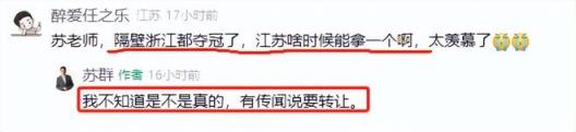 此外蘇群還釋放了兩大信息。一條信息是昔日傳統球隊江蘇隊正在尋求轉讓。有一位江蘇球迷非常羨慕廣廈隊,他在蘇群文章留言:蘇老師,隔壁浙江都奪冠了,江蘇啥時候能拿一個啊,太羨慕了。蘇群回復:我不知道是不是真的,有傳聞(江蘇隊)說要轉讓。之前有媒體人付政浩也表示CBA有的球隊尋求轉讓,不知道是不是指的是江蘇隊。