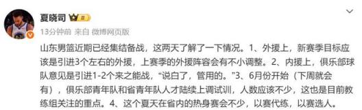 雷速體育5月23日訊 據(jù)媒體人“夏曉司”報(bào)道,山東男籃新賽季計(jì)劃引進(jìn)三名左右新外援和1-2名來(lái)之能戰(zhàn)本土球員。