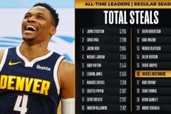 比賽第二節,威少送出1次搶斷,生涯搶斷總數達到1945次,超越科比(1944次)獨占NBA歷史第16。