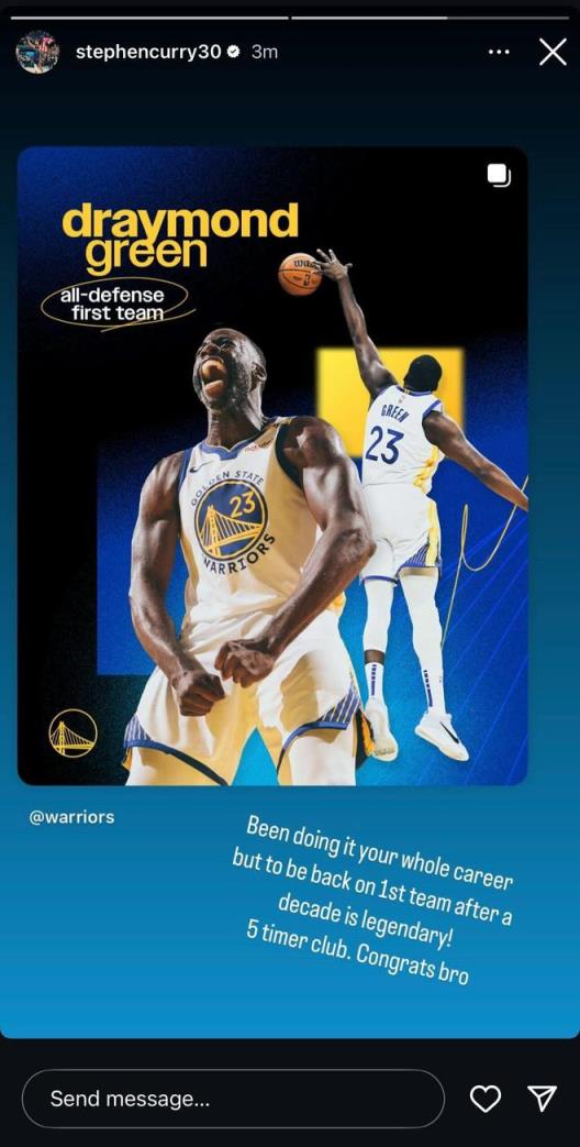 在結(jié)果公布之后,勇士隊(duì)當(dāng)家球星庫里第一時(shí)間更新社媒,恭喜了自己的老隊(duì)友追夢(mèng)。庫里寫道:“你整個(gè)職業(yè)生涯都在做這件事,但在距離首次入選最佳防守一陣十年后仍能入選最佳防守一陣真的非常傳奇!五次最佳防守一陣,恭喜你兄弟。”
