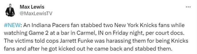 北京時間5月28日,據(jù)記者M(jìn)ax Lewis報(bào)道,24歲的步行者球迷芬克因在印第安納州卡梅爾市一家酒吧觀看東部決賽第二場時刺傷兩名尼克斯的球迷而被捕。
