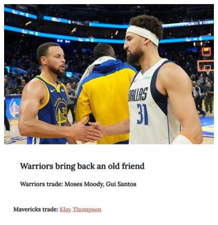 第三筆用穆迪+桑托斯將克萊從獨行俠換回來??巳R才是最熟悉科爾體系與庫里打球方式的二號位,克萊的空間能力可以最大限度發揮庫里的能力,庫里+克萊+巴特勒+追夢的組合才是勇士球迷最希望看到的。