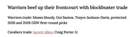 第二筆交易是用穆迪、桑托斯、戴維斯、2026年首輪、2028年首輪從騎士換來賈萊特0阿倫、小克雷波特。這筆交易勇士補強了最弱一環五號位,科爾雖然喜歡用死亡五小,可他也深知有一個頂級的吃餅內線+護框內線多么重要,如果阿倫能來到勇士,這支勇士的防守有希望成為聯盟前三。