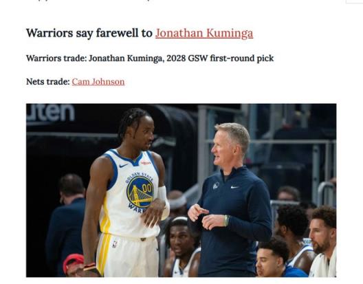 第一筆交易就是送出庫明加、2028年首輪簽得到卡梅倫-約翰遜,庫明加需要先簽后換。因為庫明加不適合科爾的傳切體系,他也不愿意努力防守,打球的體質與球隊不符,而卡約不同,身高6尺8的卡約有出色的投射能力與傳導球能力,卡約還是一個頂級的防守側翼,他完美契合勇士體系,不占用球權深得科爾之心。