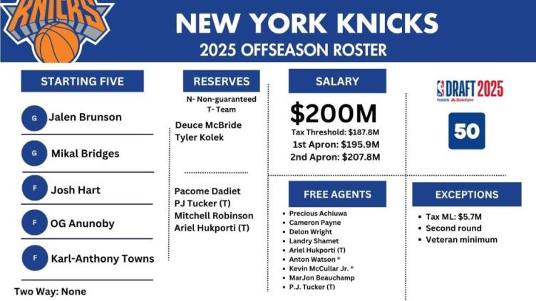 尼克斯的核心輪換:布倫森、阿奴諾比、布里奇斯、唐斯、米羅、麥克布萊德、哈特等人都還身背合同,他們秀撒氣要如何運(yùn)作令人期待。