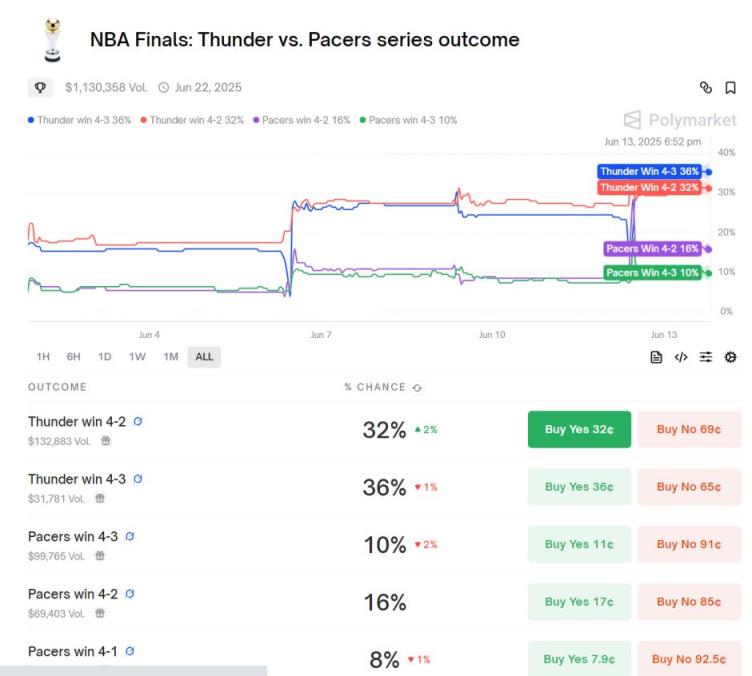 美媒Polymarket認為雷霆奪冠概率還有68%,步行者只有32%。大家覺得呢?