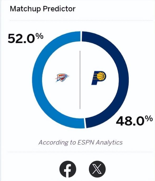 ESPN預測這場G4,雷霆客場作戰贏球概率52%,主場作戰的步行者只有48%的贏球概率。