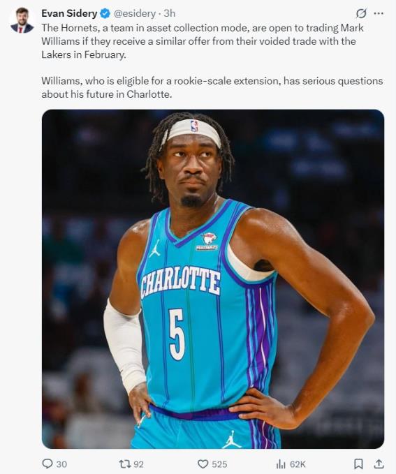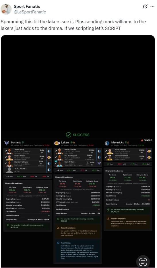 黃蜂得到:哈迪、克內克特、威廉姆斯、2030年獨行俠次輪、湖人2031年首輪簽、湖人2030年首輪互換權;