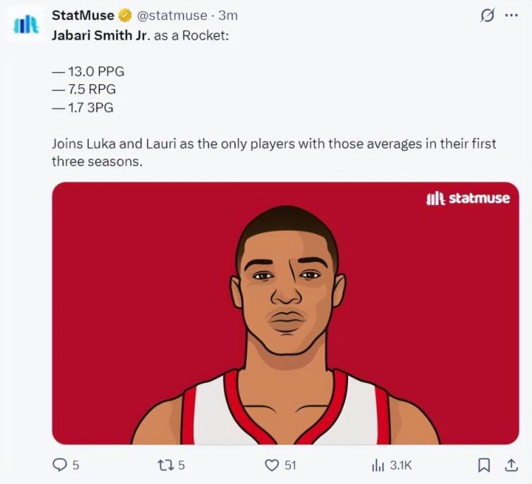 小賈在火箭的三個賽季場均13分7.5籃板1.7個三分球,他成為自東契奇、馬爾卡寧后第三位新秀前三個賽季就能達成這樣場均數據的球員。