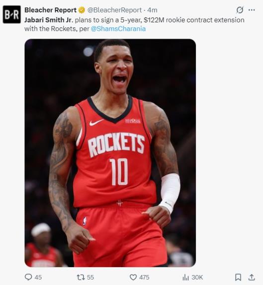 北京時間6月30日,ESPN報道,休斯頓火箭隊與小賈巴里-史密斯達成一份為期五年價值1.22億的提前續約,這份合同是火箭高層與史密斯經紀人華萊士-普拉瑟談妥,這份合同是全額保障性合同,合同在2030-31賽季才到期。