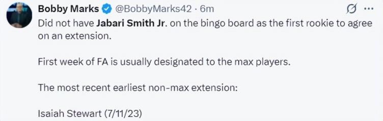 薪資結構專家鮑比-馬克斯報道,在今夏新秀的提前續約談判中,小賈巴里-史密斯一度被列入“候選名單”,但他卻成為第一個達成提前續約的球員,過去最早一次達成非頂薪續約是2023年7月11日的斯圖爾特。