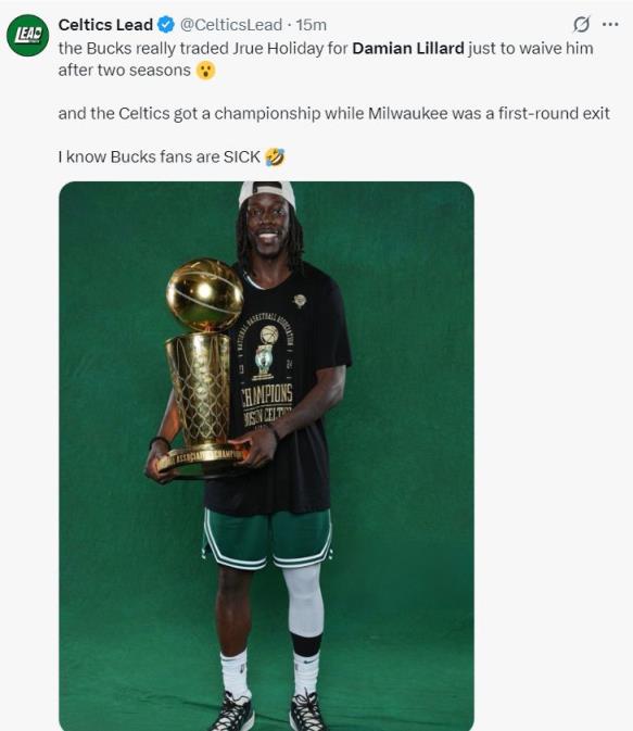凱媒:雄鹿用霍勒迪換去了利拉德,僅僅過(guò)去兩個(gè)賽季就裁掉了利拉德,太不可思議了,綠凱則拿到了總冠軍,雄鹿是首輪出局。