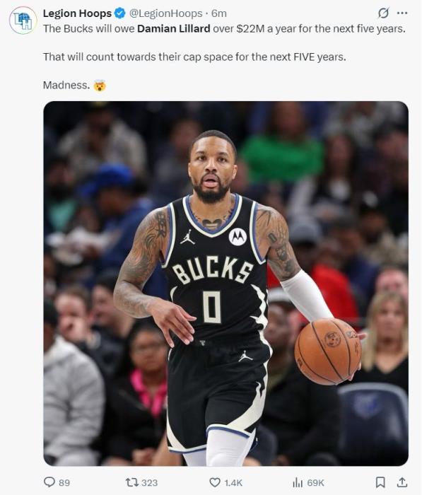 根據(jù)美媒LH的報(bào)道,在未來(lái)的五年里,雄鹿每一年都需要向利拉德支付2250萬(wàn),這些薪水也會(huì)占據(jù)雄鹿每一年的薪金空間。