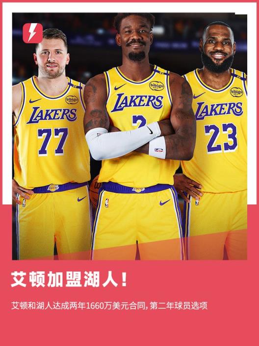 雷速體育7月3日訊 據(jù)名記Shams報道,自由球員中鋒艾頓同意和湖人簽約。