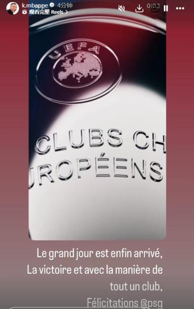 姆巴佩祝福巴黎奪冠:“偉大的日子終于來臨,這場勝利是屬于整個俱樂部的榮光。恭喜@巴黎圣日耳曼。”↓