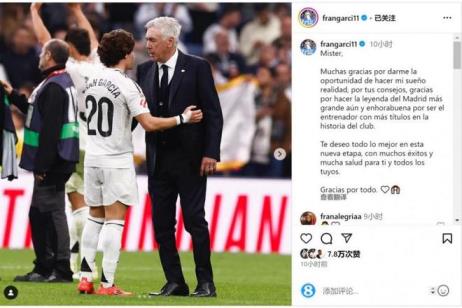 5月24日訊 皇馬主帥安切洛蒂今夏離任,弗蘭-加西亞更新社媒動態,與安帥告別。