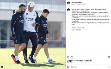 5月25日訊 安切洛蒂在收官戰中正式在伯納烏告別皇馬,卡瓦哈爾更新社交媒體曬照發文向這位傳奇主帥告別。