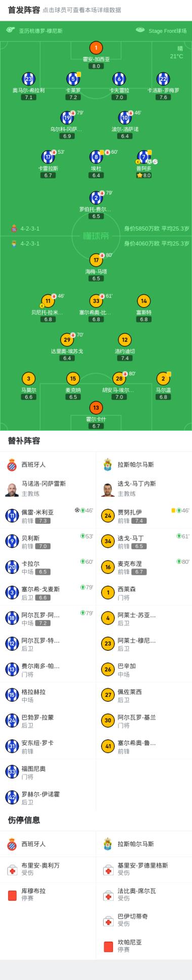 第82分鐘,西班牙人球員普阿多助攻佩雷-米利亞打入一球。