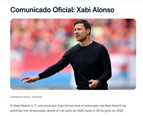 阿隆索將于當地時間5月26日星期一中午12:30(北京時間18:30),以皇馬新帥身份在皇馬體育城出席就職儀式。就職儀式結束后,哈維-阿隆索將在皇馬體育城新聞廳接受媒體采訪。