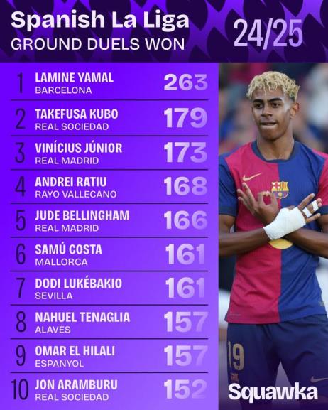 據統計,巴塞羅那的亞馬爾是本賽季西甲聯賽贏得地面對抗次數最多的球員。