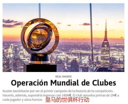 《阿斯報》透露,皇馬將世俱杯的獎金,放在與歐冠相同的級別。如果皇馬奪得世俱杯冠軍,每名球員都能獲得(稅前)100萬歐元的重獎!皇馬一線隊23名球員的話,光是奪冠獎金支出,就高達(dá)2300萬歐元。