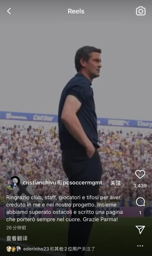 雷速體育6月9日訊 即將出任國際米蘭主教練后,齊沃更新個人社交平臺,向老東家帕爾馬告別。