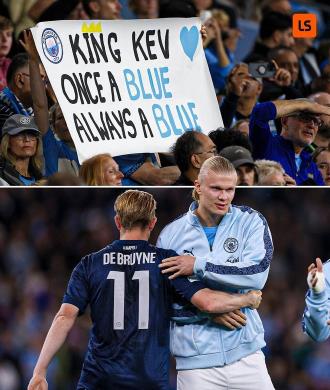 賽前,曼城主場看臺打出了致敬“國王凱文”的TIFO,歡迎這位藍月傳奇回歸。而首發出戰的德布勞內目睹如此暖心舉動,也百感交集。遺憾的是,“丁丁”的回家之戰卻沒能踢多少時間。
