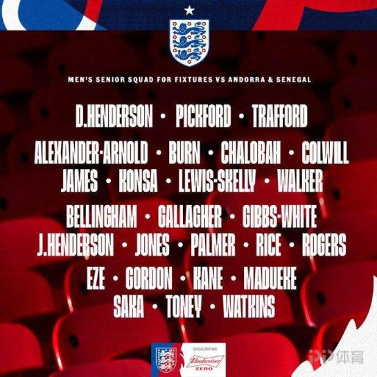 英格蘭隊(duì)今日公布最新一期大名單,在即將到來的國際比賽日中,英格蘭將對陣安道爾和塞內(nèi)加爾。