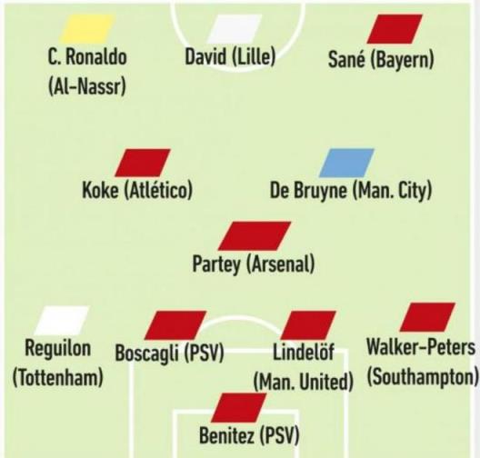 前鋒:C羅(利雅得勝利)、戴維(里爾)、薩內(拜仁)