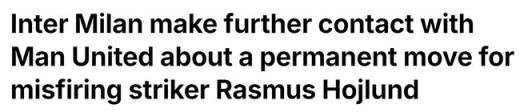 據悉,國米希望先租后買,一旦霍伊倫德的表現達到設定指標,就必須強制性買斷。但曼聯還沒有開放出租之門,堅持要永久轉會。《每日郵報》稱,如果曼聯同意把價格降得更低,藍黑軍團也有可能同意直接買下,他們已經就永久轉會的可能性與紅魔進行了進一步的接觸。