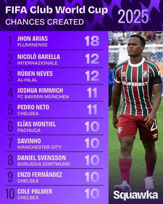 直播吧7月11日訊 本屆世俱杯僅剩巴黎vs切爾西的決賽,數據機構squakwa也統計了本屆賽事創造機會情況,弗魯米嫩塞的27歲前鋒瓊-阿里亞斯獨自領跑。